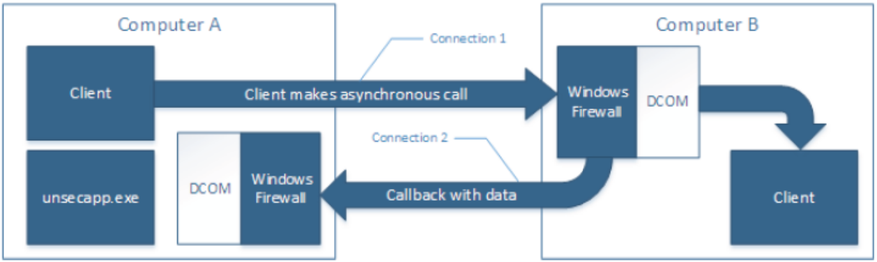 비동기 통지에서는 원격 컴퓨터가 콜백을 클라이언트 컴퓨터에 송신하는(그래서 반대 접속을 오픈하는)것이 필요하기 때문에 통신이 제대로 작동하려면 Windows방화벽 및 DCOM이 올바르게 구성되어 있어야 합니다.